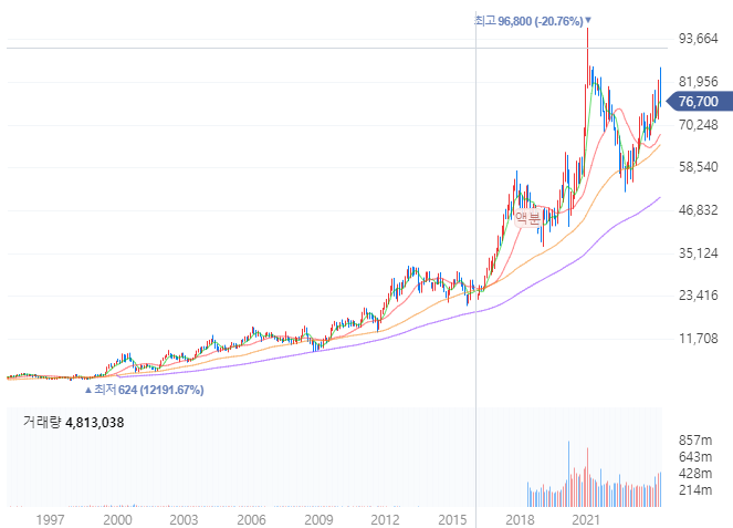 하지만 장기적인 관점에서 20년 이상 바라보게 되면 우측으로 매우 높은 상승을 일으키는 우상향의 그래프를 확인할 수 있습니다.